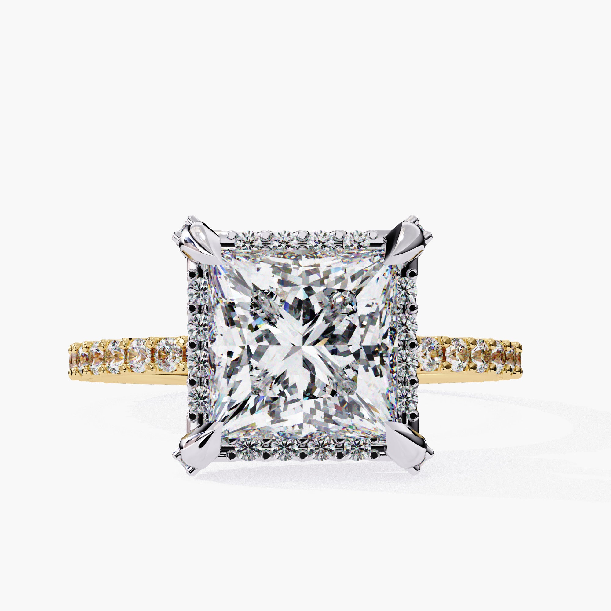 The princess cut diamond takes center stage, adorned with a hidden halo delicately wrapped around the crown, creating a captivating illusion of seamless unity. Framed by a dazzling halo of pave-set diamonds and nestled atop a lustrous pave band, this ring exudes timeless beauty and refined luxury.