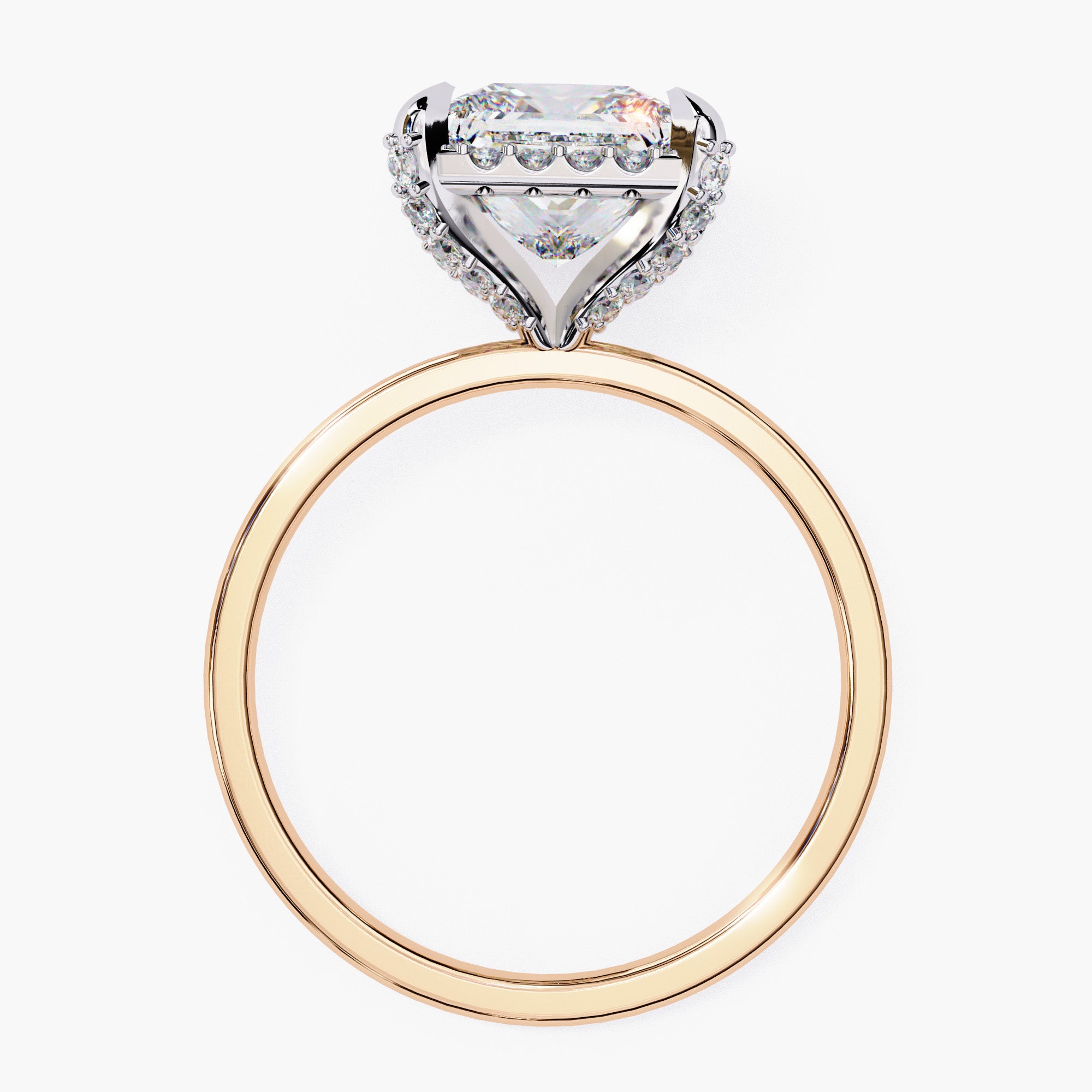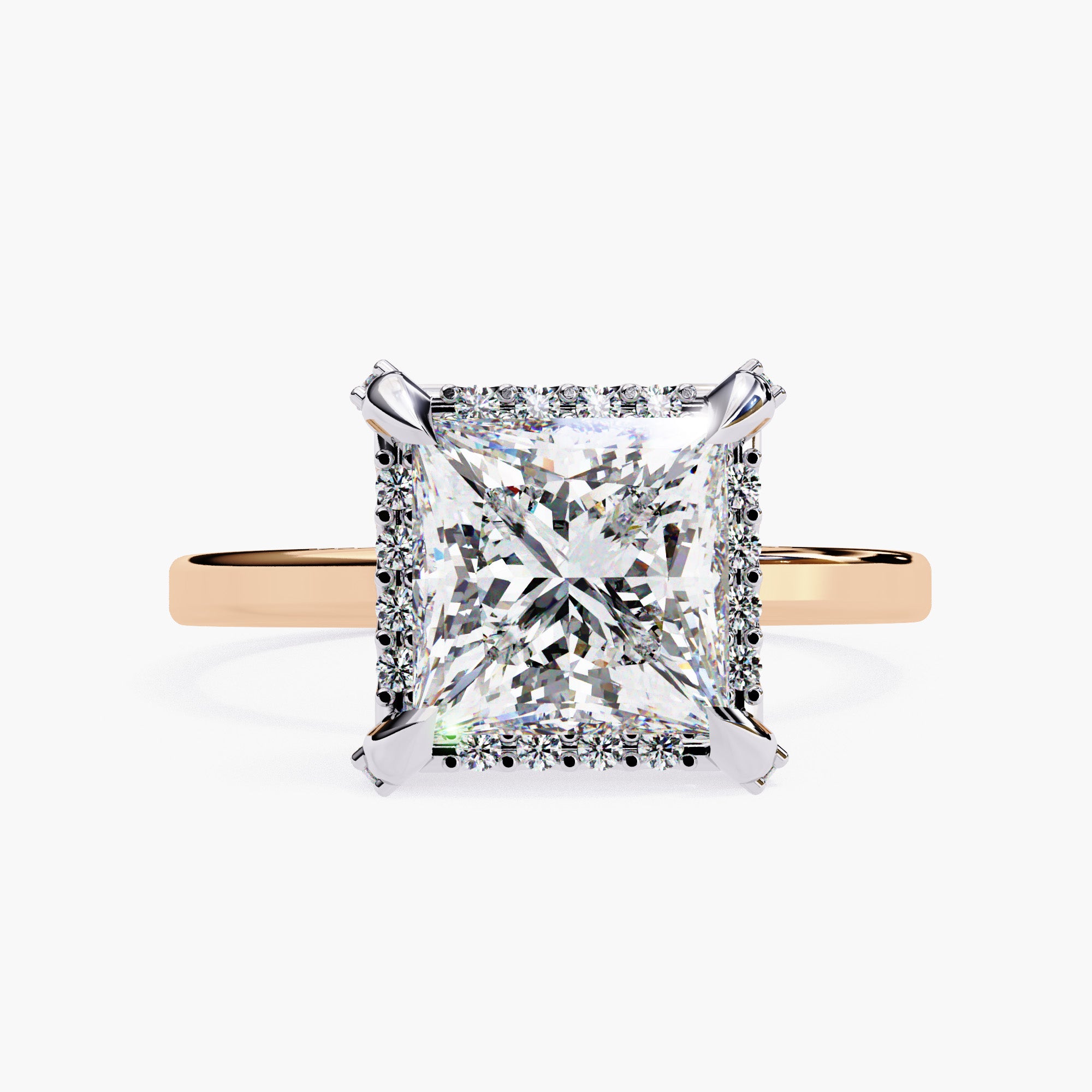A mesmerizing hidden halo design that adds a touch of glamour and intrigue to this ring. The princess cut diamond takes center stage, surrounded by a delicate halo of shimmering diamonds that create a captivating illusion of endless sparkle both around and beneath the diamond.