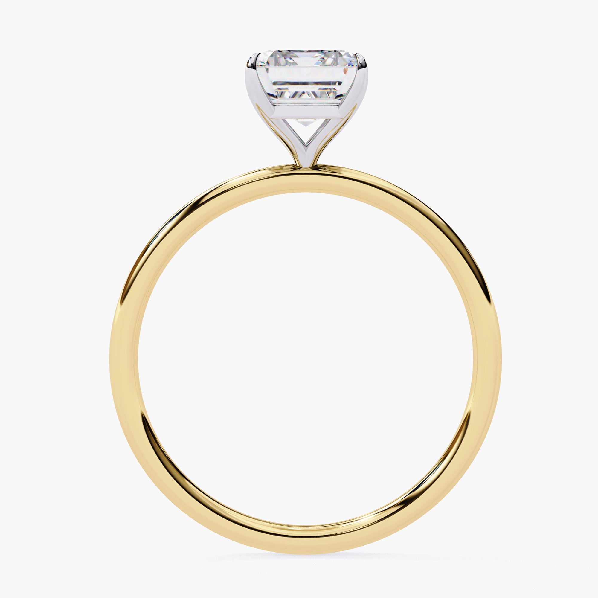 This ring showcases the regal beauty of an emerald-cut diamond, delicately cradled by four pristine prongs. This design captures the diamond's captivating clarity and sleek lines, evoking an air of refined elegance and timeless sophistication, making it an exquisite choice for those drawn to understated luxury.