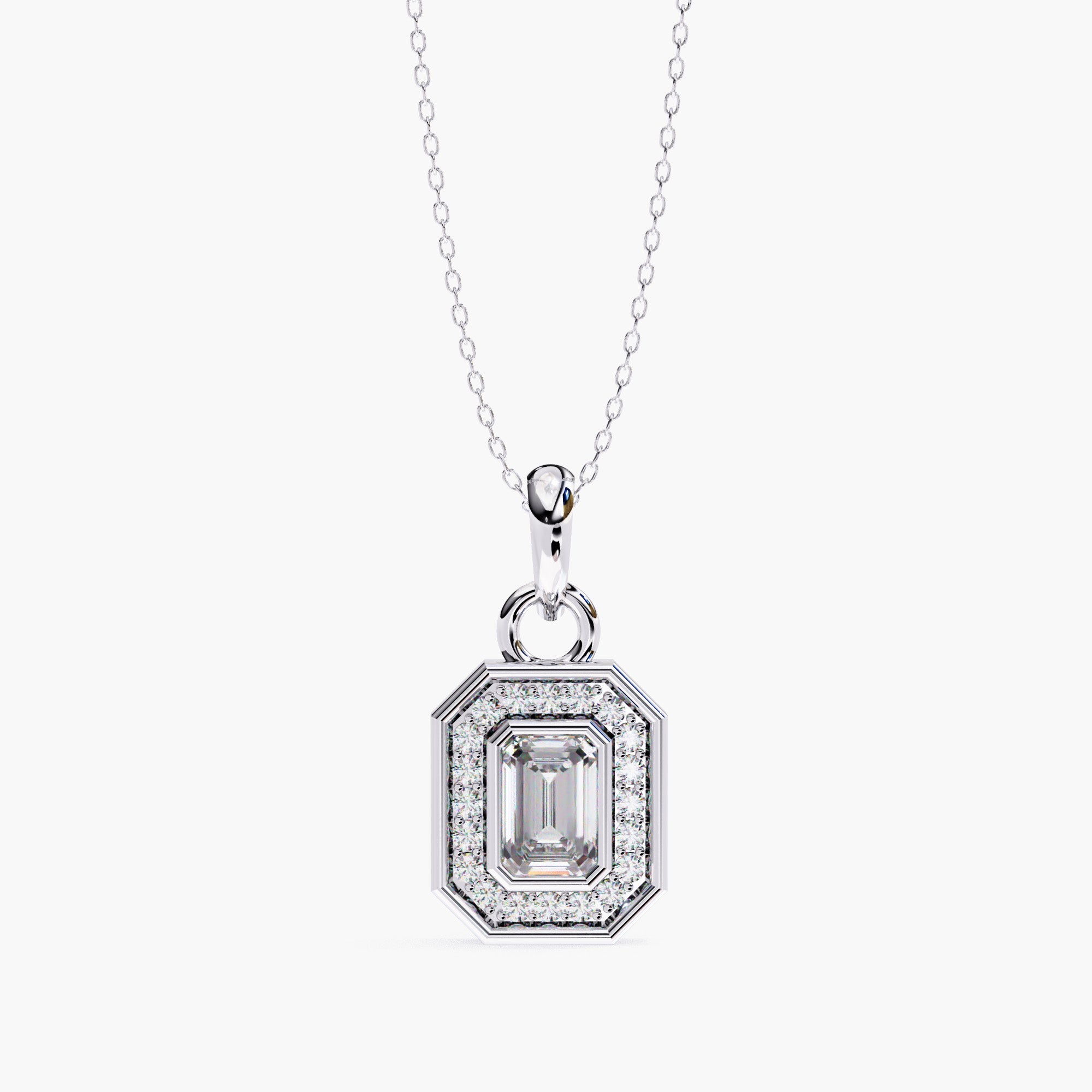 A stunning emerald diamond encased by a pave setting of sparkling diamonds, creating an enchanting halo effect. Crafted with fine quality and precision, this pendant exudes elegance and luxury. Elevate any outfit with this timeless and radiant piece.