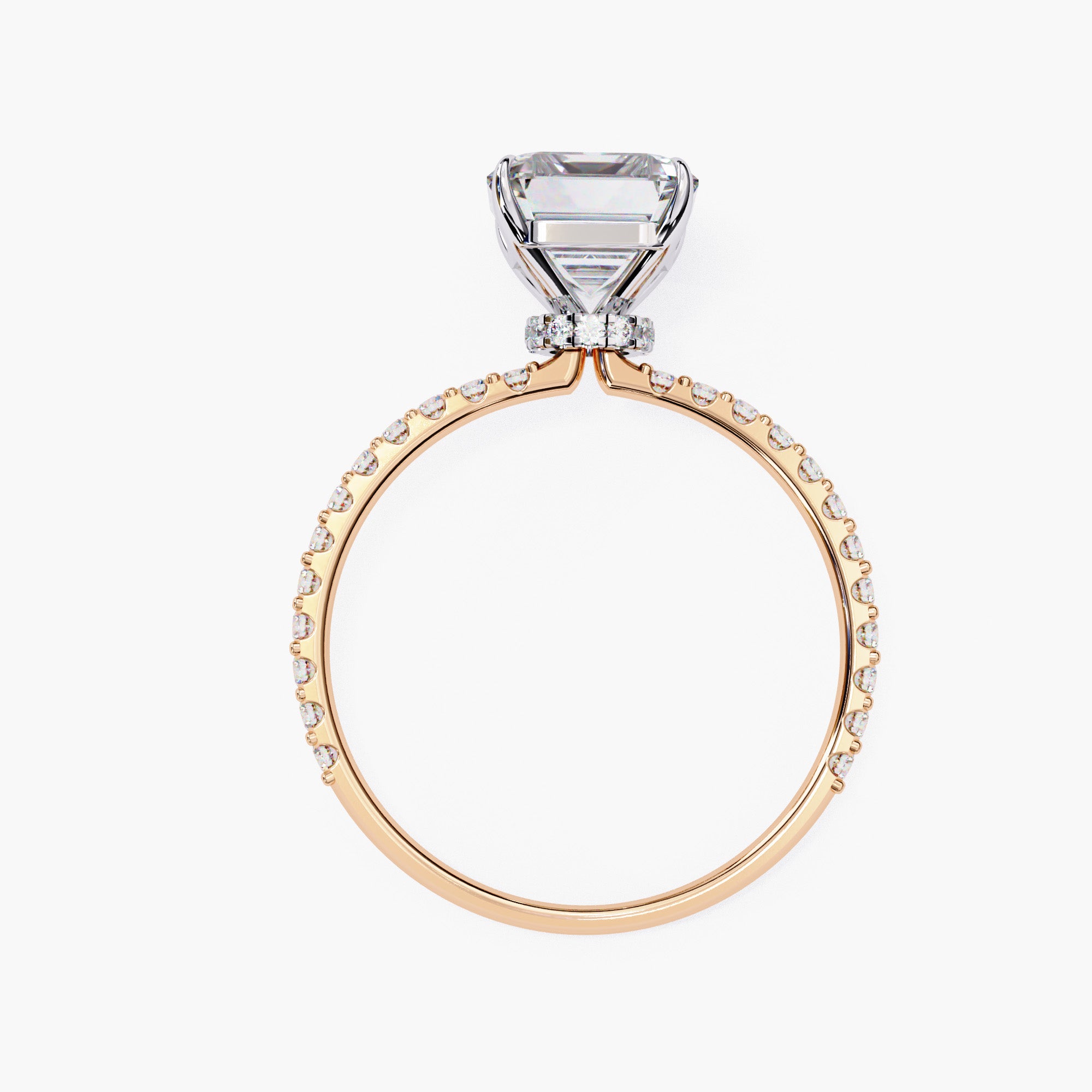 This exquisite emerald diamond ring features a hidden halo delicately encircling the crown, creating a mesmerizing illusion of seamless continuity. Crafted to perfection, the hidden halo adds a touch of enchantment, effortlessly tying together the entire ring in a captivating display of elegance and sophistication, making it a stunning choice for those who appreciate refined intricacy and timeless beauty.
