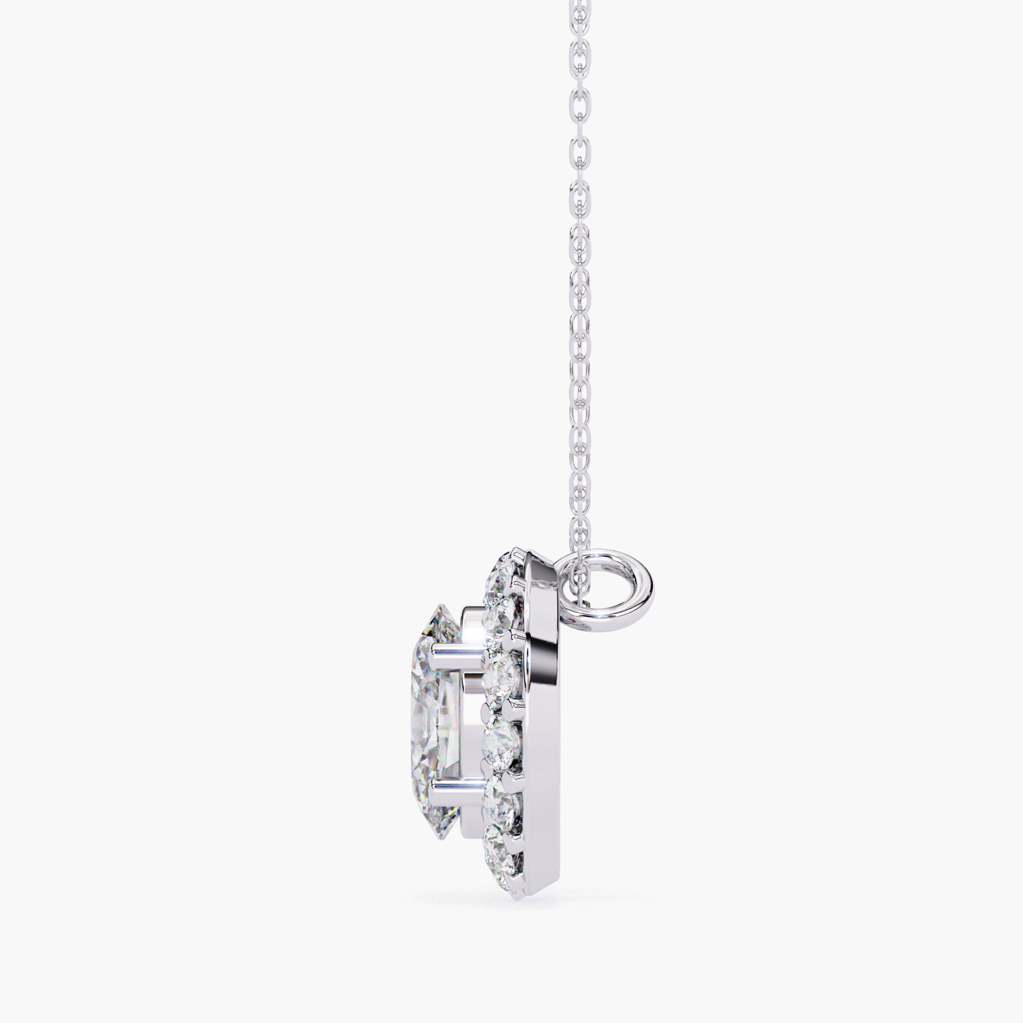 Embrace timeless elegance with this enchanting oval diamond pendant, masterfully set within a radiant halo. The centerpiece oval diamond, cut to showcase its luminous clarity, is encircled by a constellation of smaller diamonds, enhancing its brilliance. The harmony of the design speaks to a love of classic beauty, making this pendant an heirloom in the making.