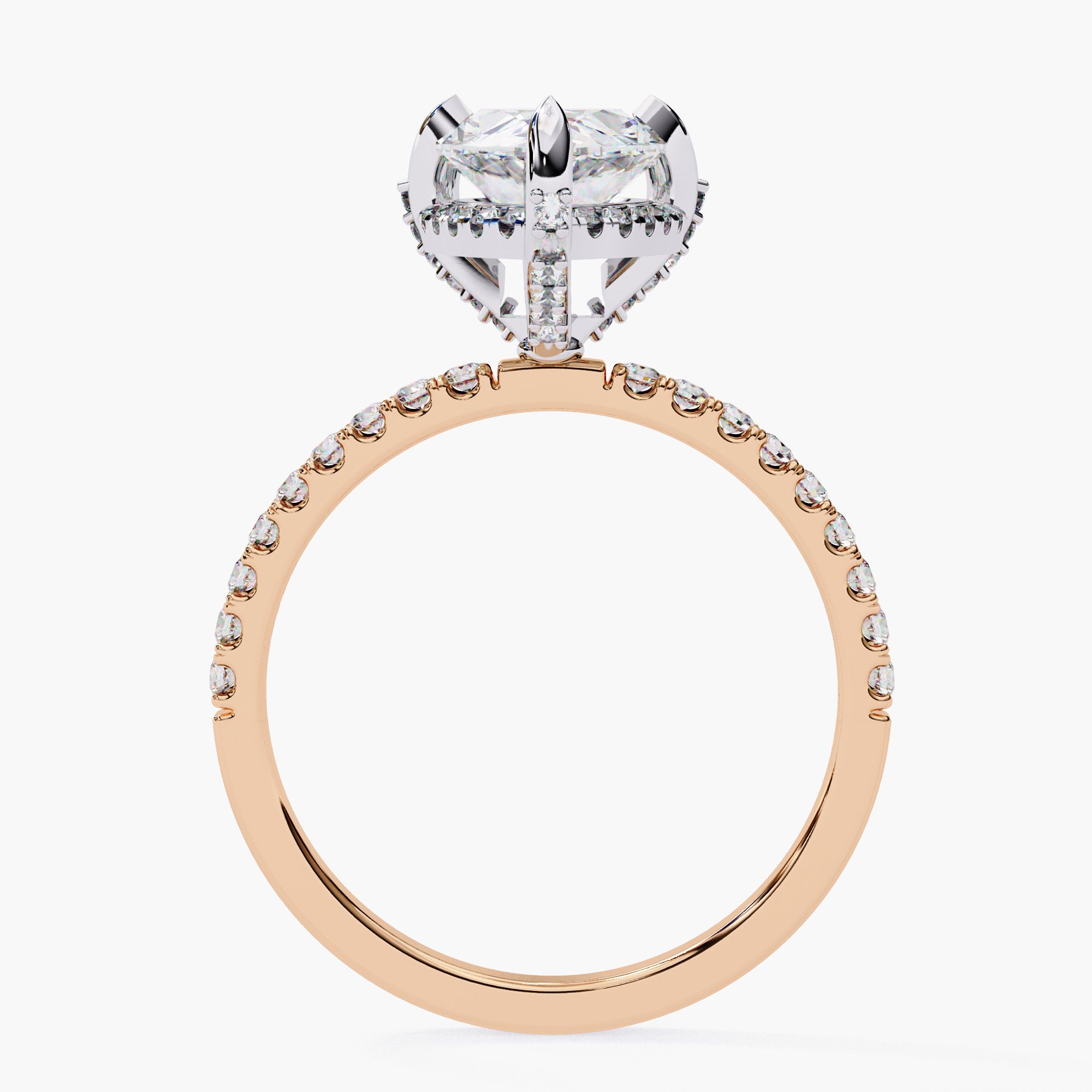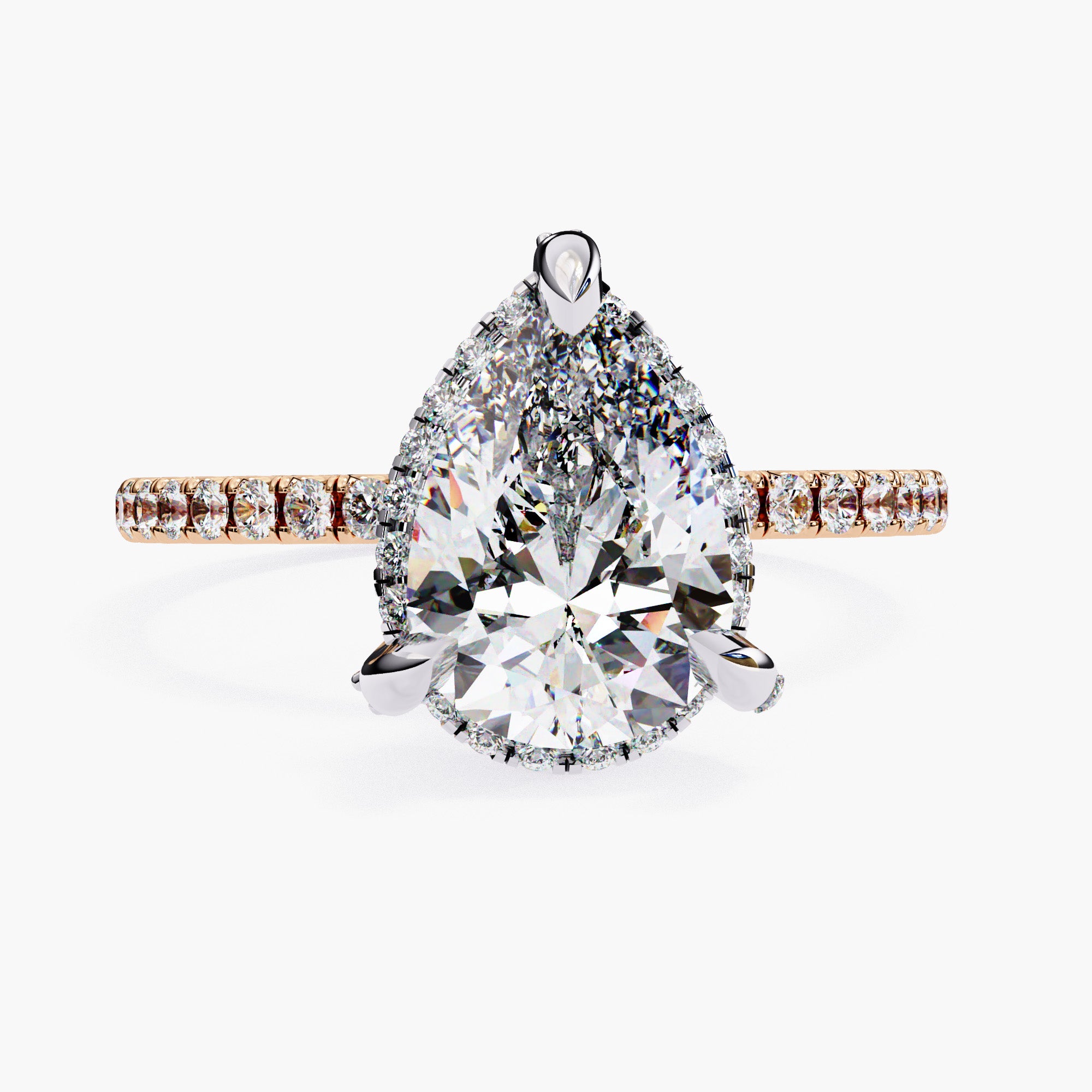 This exquisite ring boasts a pear-shaped diamond, gracefully highlighted by a hidden halo nestled within the guardian rails and prongs, lending an understated glow. The slender band, paved with a sequence of diamonds, wraps the finger in a delicate stream of light, perfectly complementing the central stone's unique silhouette.