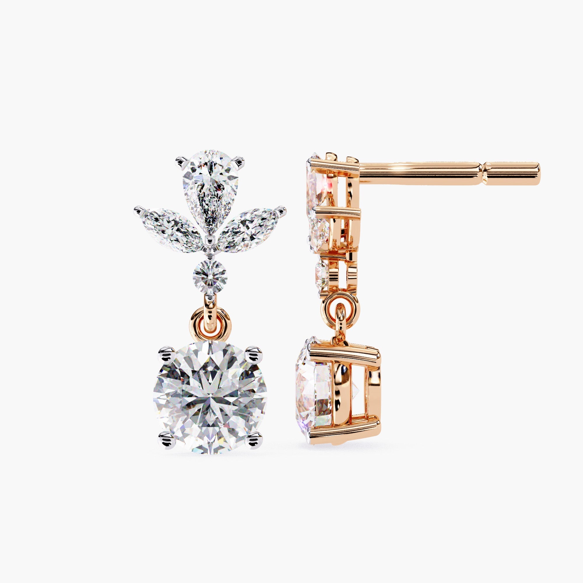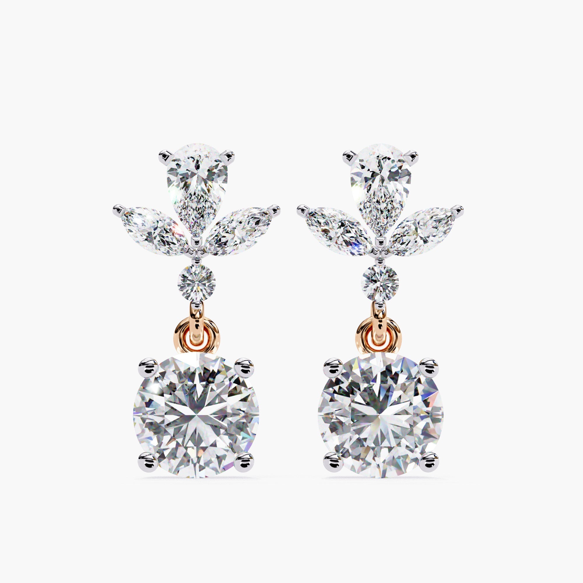 Adorning a pear-shaped diamond crest, flanked by marquise diamonds and anchored by a round diamond duo, these earrings are a symphony of luxury. They parade a design that's as lavish as it is graceful, perfect for those moments that call for a touch of opulence.