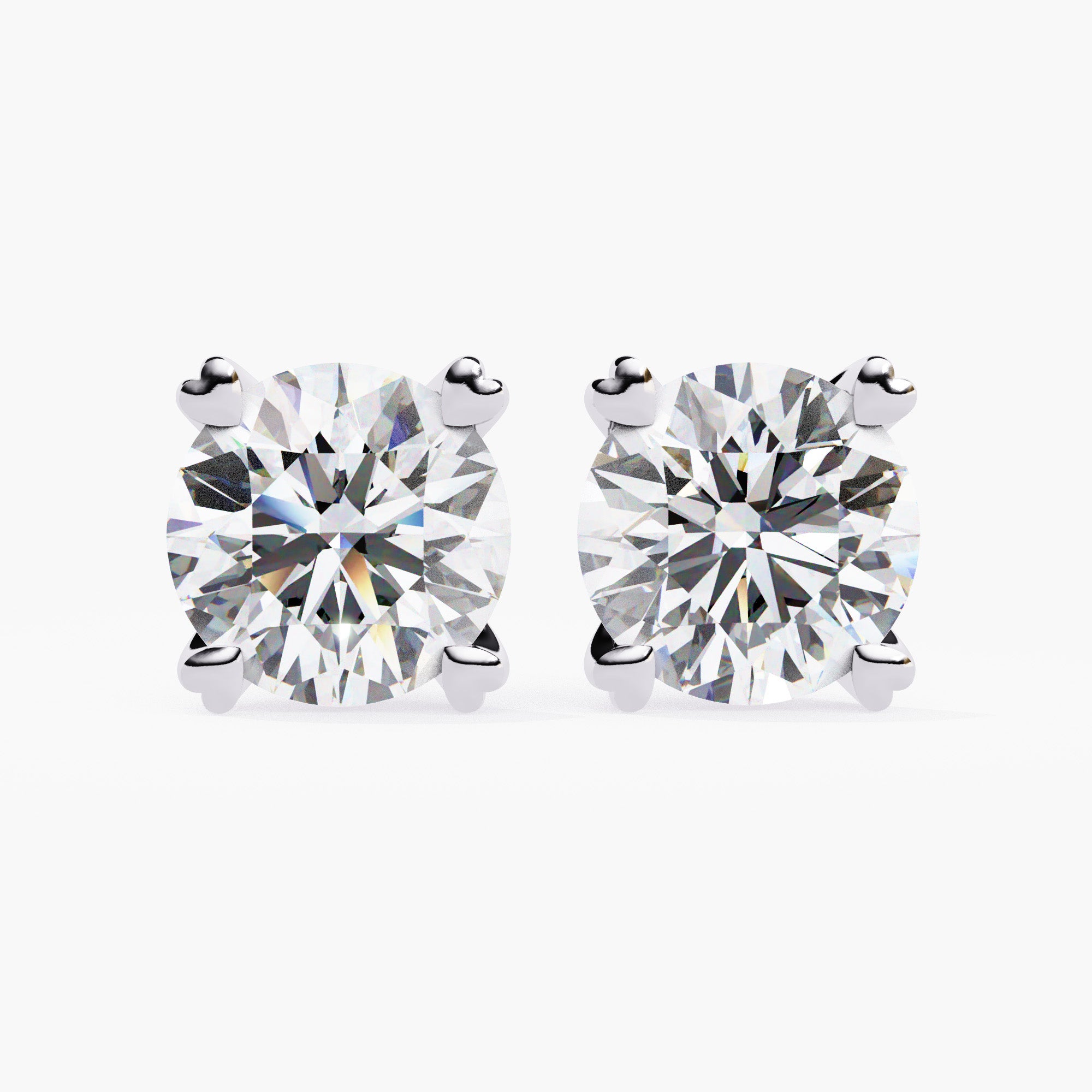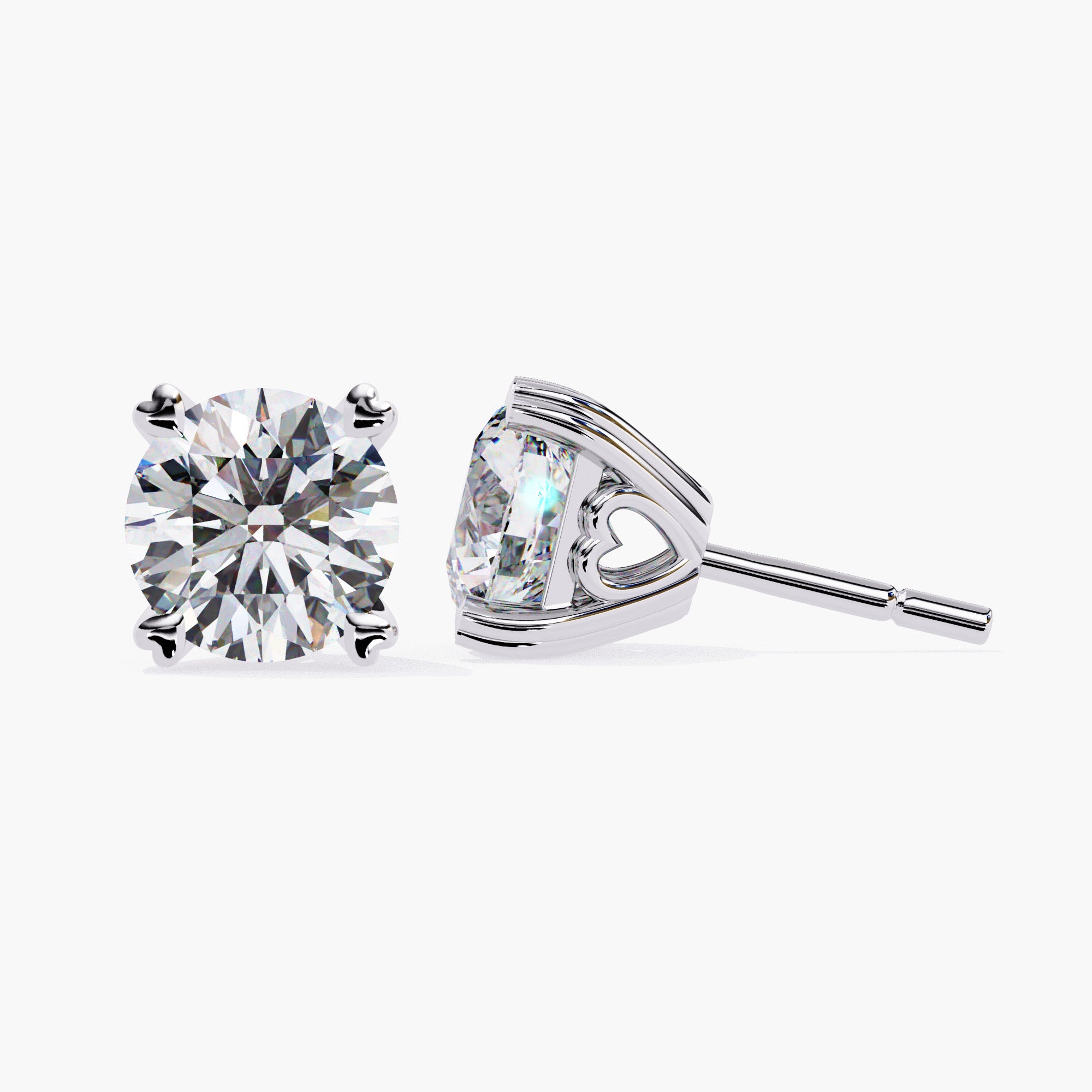 Embrace elegance with these classic round diamond studs, delicately held by heart-shaped prongs and crowned with a charming heart detail—a romantic twist on a timeless design.