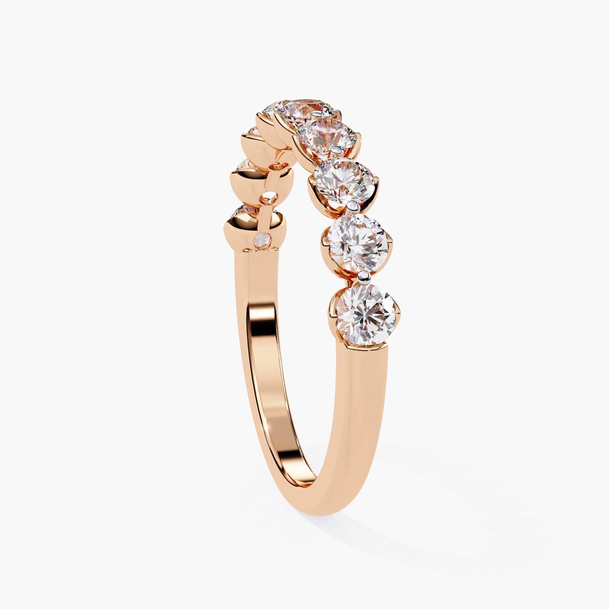 Explore a half-band adorned with shared prong-set round diamonds, offering a blend of classic charm and contemporary flair. This exquisite band is a testament to love, crafted for those who cherish the timeless beauty of round diamonds.