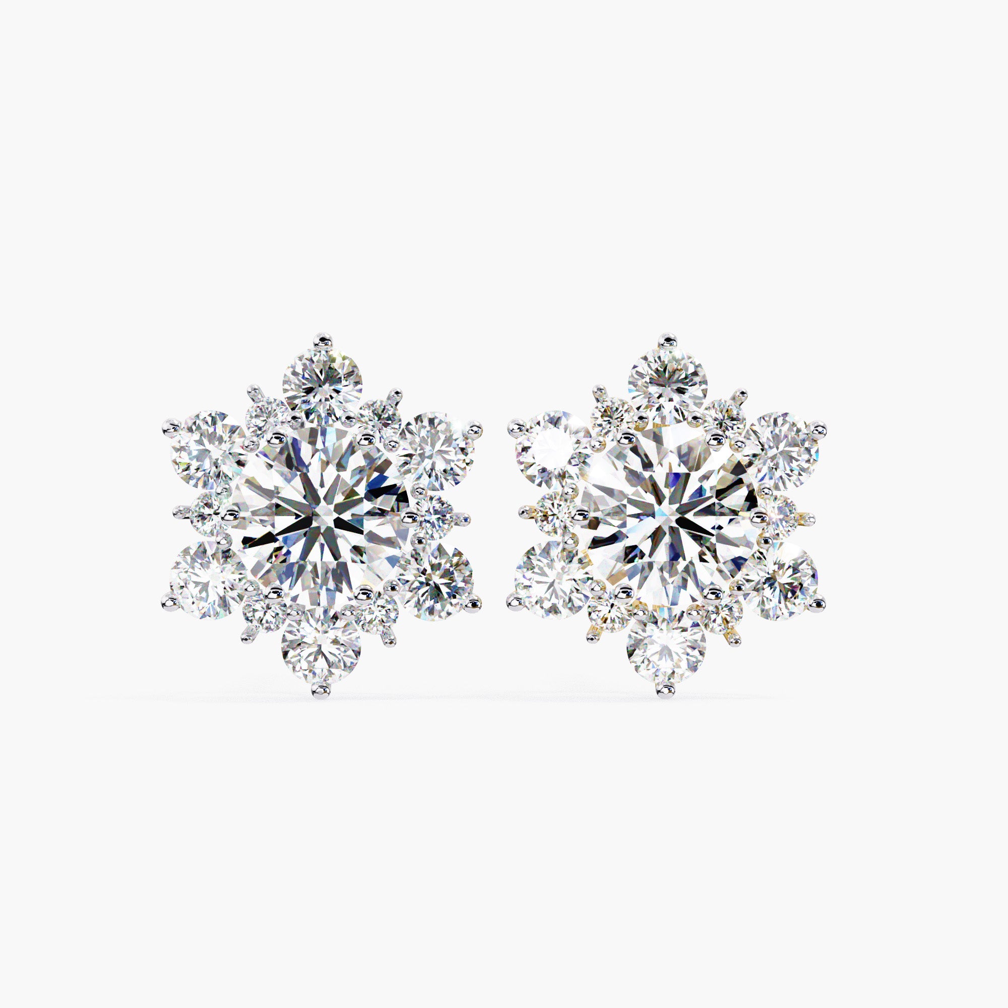 A classic round diamond surrounded by constellation of smaller round diamonds for that perfect halo design that brings a sophisticated glow to any look.