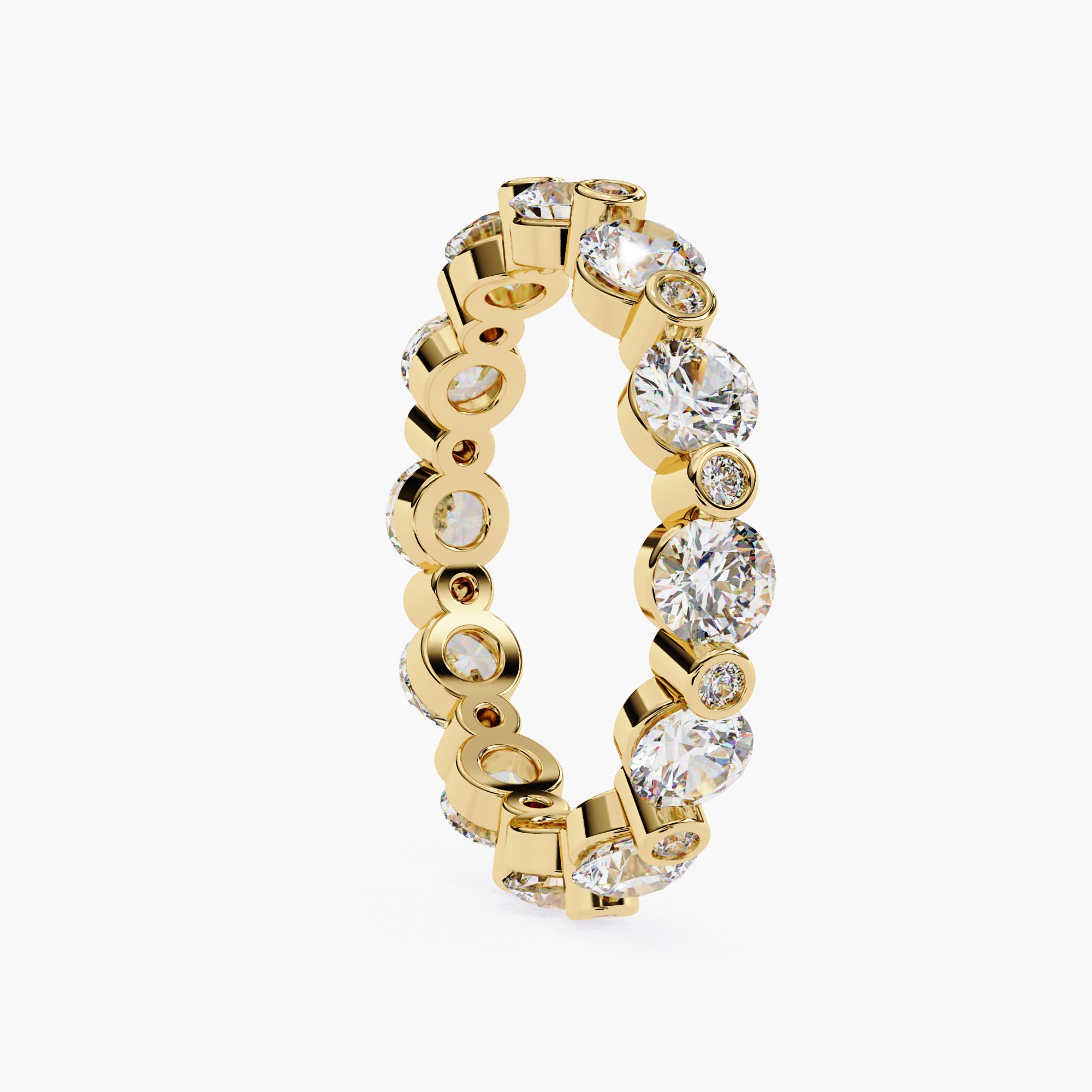 A round diamond eternity band that redefines luxury with its unique shared bezel prong setting. Accentuated with petite diamonds for added brilliance, this band is more than just luxurious—it's a statement. Crafted for those who seek unparalleled elegance in an eternal symbol of love, it's perfect for discerning individuals ready to impress.